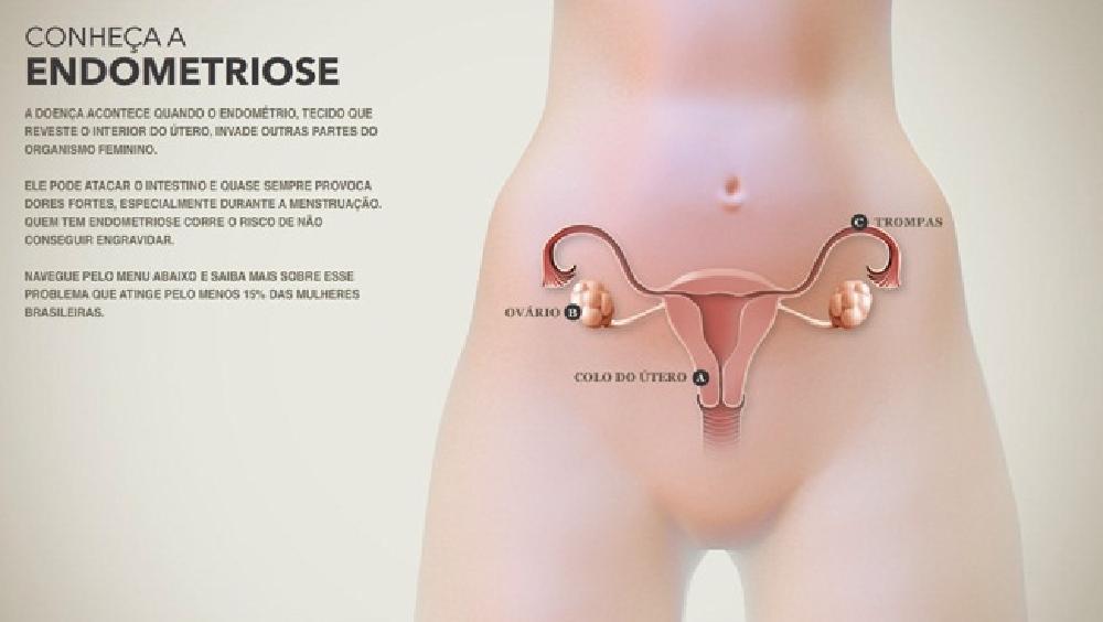 ?A endometriose ocorre quando o tecido (mucosa) que reveste a parede interna do útero (endométrio) cresce em outras regiões do corpo, causando dor, sangramento irregular e possível infertilidade.?explica ?Estes novos crescimentos teciduais normalmente ocorrem na região pélvica, fora do útero, nos ovários, no intestino, no reto, na bexiga e na delicada membrana que reveste a pélvis. Entretanto, os implantes também podem ocorrer em outras partes do corpo?.
